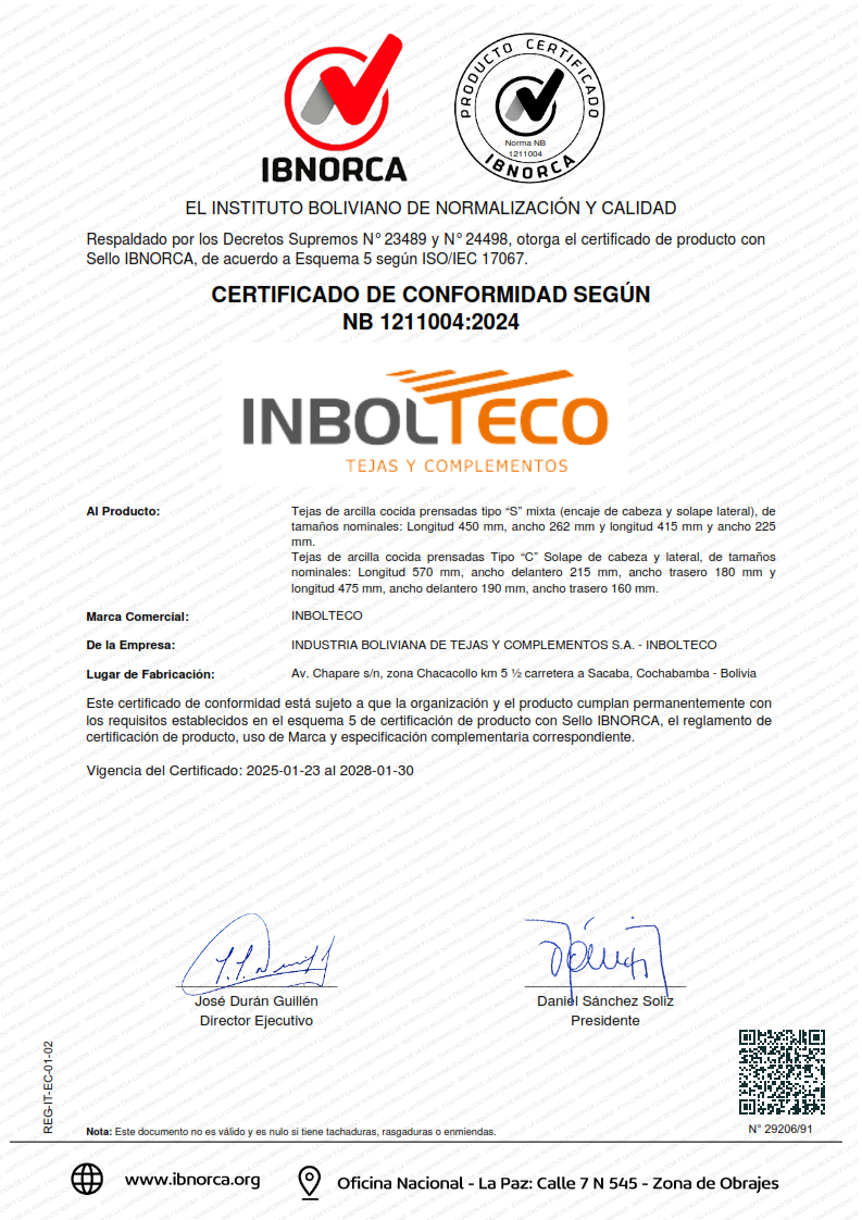 Es así que el INSTITUTO BOLIVIANO DE NORMALIZACION Y CALIDAD (IBNORCA), mediante la Norma Boliviana NB 1211004, garantiza al cliente el disponer de productos que cumplen con pruebas y ensayos de: